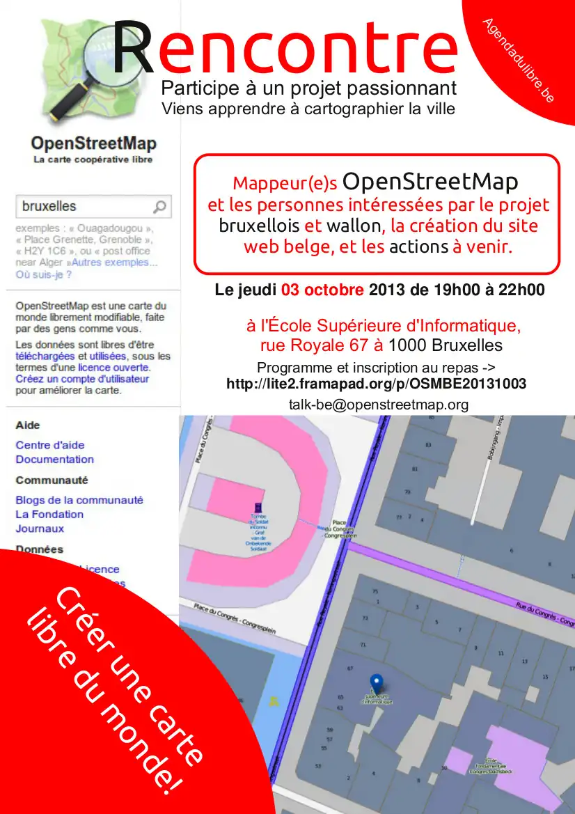 A meeting at École supérieure d'informatique ( http://osm.org/go/0EoTiW96D--?m= , rue Royale 67 à 1000 Bruxelles, very close to Brussels Central Station and cheap restaurants ) on Thursday 3 october from 19h till 21 or 22h then go for a dinner nearby for those who want. The drinks will be offered by the school.