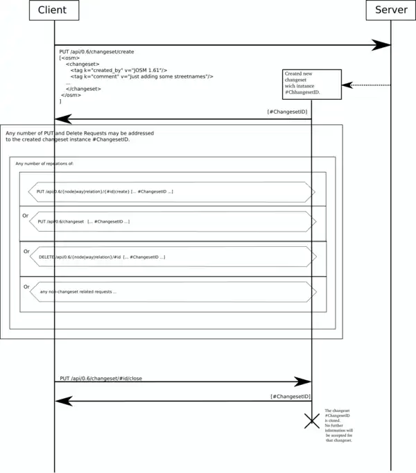 Changesets are 'opened' at the beginning of an editing session, and 'closed' at the end. A closed changeset is fixed and cannot be edited further. A changeset may be closed either explicitly (see the documentation for the editor you are using), or automatically (after a period of inactivity, currently one hour). The same user can have multiple open changesets at any one time. Changesets have a maximum capacity (currently 10,000 elements), maximum open time (currently 24 hours), and an idle timeout (currently 1 hour).