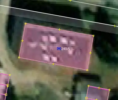 | Horní budova ještě neupravená, dolní (označená) už rozdělená: |