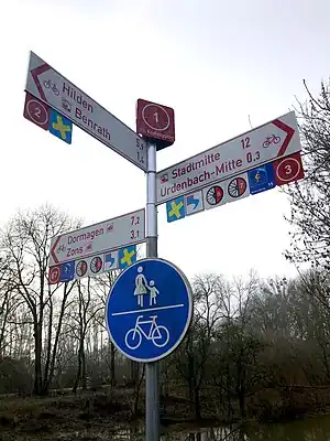 direction_north=*können die benannten Ziele mit Entfernungen eingetragen werden, währenddirection_north:route=*die ausgeschilderten Routen enthält, also die Nummern benachbarter Knotenpunkte und ausgeschilderte Radrouten mit Symbolen. Solche Routen in Düsseldorf sind z.B. die unter User:Henry572/Fahrradrouten aufgelisteten. - Wegweiser mit Fotos dokumentieren. Dazu gibt es die Category:Cycling route signs in Düsseldorf und schon viele Fotos von User:Velopilger und User:Henry572. In OSM kann per