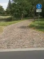 Radweg Der Radweg ist baulich durch einen Grünstreifen, Graben, Büsche, usw. von der Fahrbahn abgesetzt, eine bauliche Trennung liegt vor. Ein Gehweg ist entweder nicht vorhanden oder verläuft durch einen Grünstreifen o.Ä. getrennt etwas abseits des Radweges und ist als weiterer eigener Weg erfasst. |