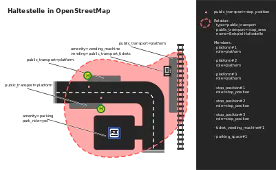 Eine Plattform (bzw. Bahn-, Bussteig) markiert sowohl den Anfahrtspunkt für das Verkehrsmittel als auch den Wartebereich für Fahrgäste. Ist dieser Bereich deutlich abgegrenzt, wird die Plattform als oder erfasst. Existiert hingegen keine klar ersichtliche Plattform, wird nur der Mast als erfasst. In jedem Fall wird dem entsprechendem Element der Tag public_transport=platform gegeben.
