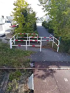 Falls die Umlaufsperre einen Bahnübergang absichert, kann dem Node , der den Bahnübergang repräsentiert, zusätzlich der Tag crossing:chicane=yes gegeben werden.