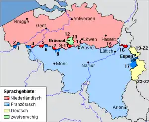 Belgien hat drei Amtssprachen (Niederländisch, Französisch und Deutsch) und vier Sprachgebiete (Brüssel wird als separates, zweisprachiges französisch-niederländisches Gebiet betrachtet), siehe Karte.