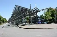 | Ein Busbahnhof mit mehreren Haltestellen, die verschiedene Strecken bedienen und die Weiterfahrt in verschiedene Richtungen ermöglichen. |