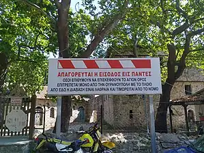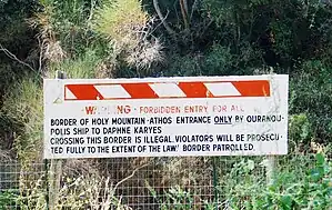 Αν και στο Άγιον Όρος χρησιμοποιούνται οι πινακίδες του ΚΟΚ, (βλ. τις πινακίδες στον δρόμο Δάφνη - Καρυές - Καρακάλλου στο YouTube.), η Ιερά Κοινότητα και η Ιερά Επιστασία έχουν θεσπίσει δικές τους πινακίδες, οι οποίες ισχύουν για συγκεκριμένα ζητήματα της χερσονήσου, ως εξής: