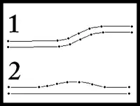 Fig.4 Kui töötled eraldusirbaga kaherealist teed, siis proovi hoida sõlmed ja jooned paralleelsed ja kohakuti, nagu joonisel 4/1. Kui üks radadest eemaldub, siis ei ole teise rea jaoks vaja sõlmi raista ja parem on tõmmata sirge joon (Joonis 4/2).