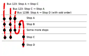 - For route master relations, a list of stops for all relations and a line for each relation indicating which stops it includes (requires some rendering work to get this 'optimal'). Stops can/should be grouped using public transport stop relations.
