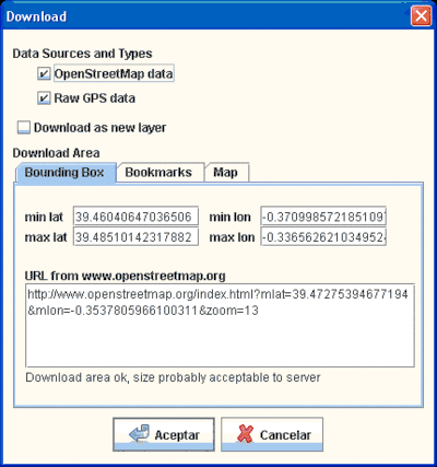 - Download as new layer: marcado para crear una nuevo layer en JOSM; desmarcado para insertar los datos en el layer JOSM activo o crear uno nuevo si no hay ninguno cargado.