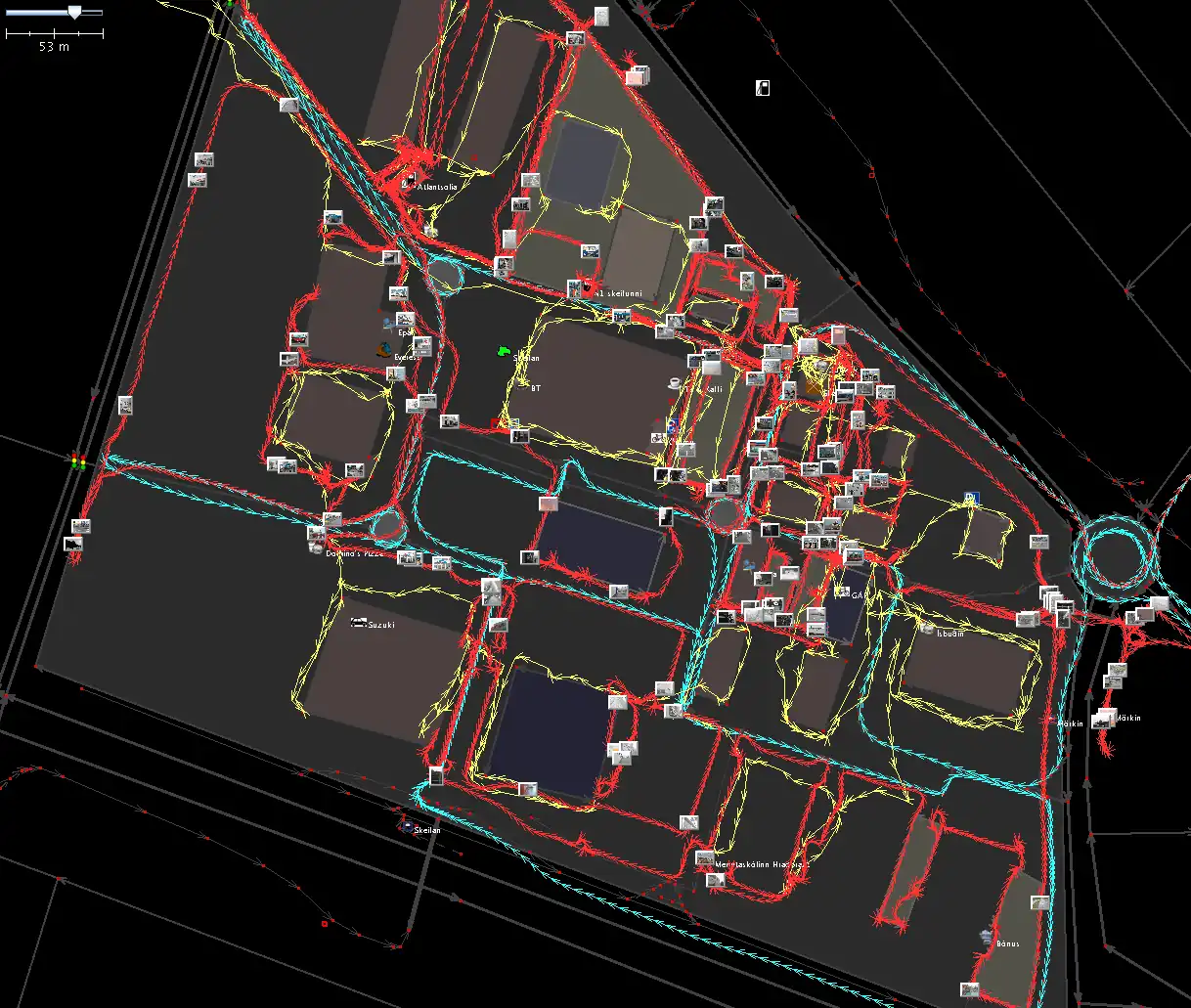 - GPX It's mostly the corners of buildings. Each point has a number and a comment which says which building it is, and which other points belong to that building.