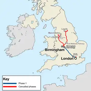 - Crewe (Phase 2a) - temporarily terminating in Crewe (proposed revamped Crewe Hub station project)
