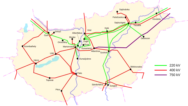 A magyar alaphálózat főként 400 kV-os, ezen túl pedig 220 kV és egy 750 kV-os vezetékekből áll. Az elosztóhálózathoz tartoznak a 132 kV-os vezetékek. (Utóbbiak nincsenek feltüntetve a fenti térképen.)