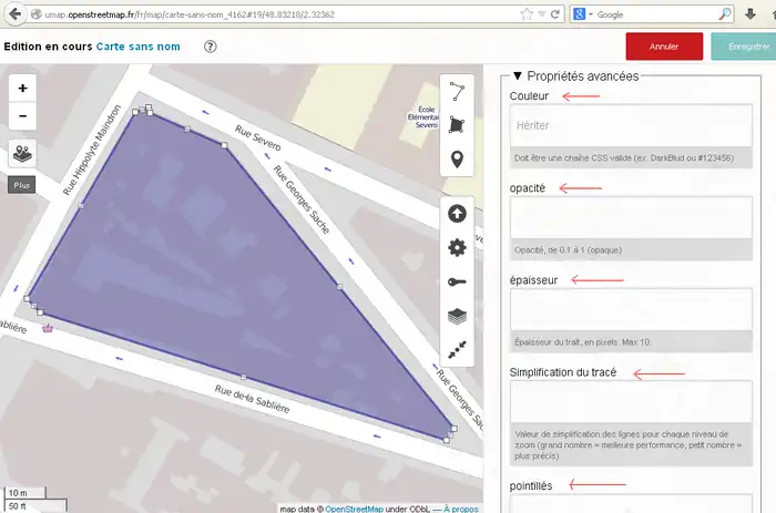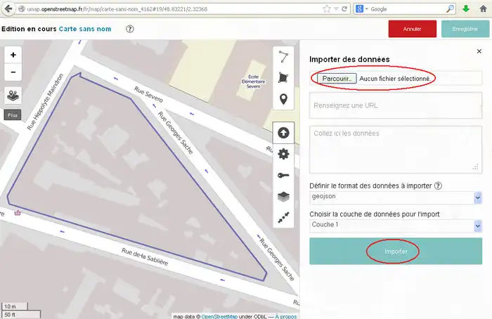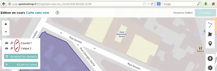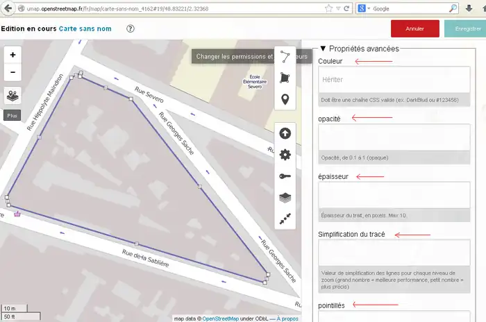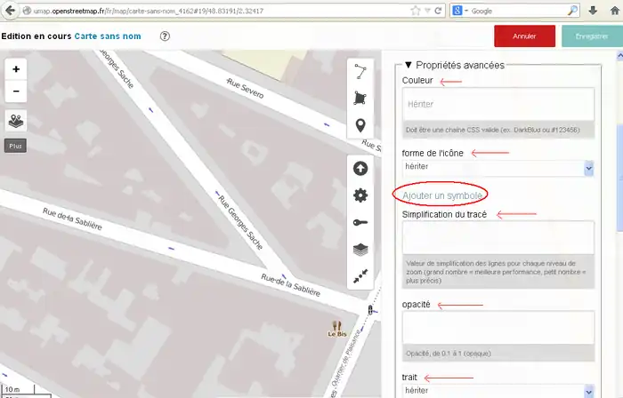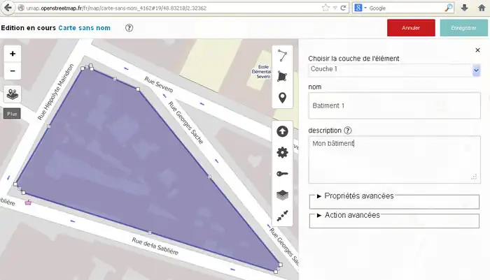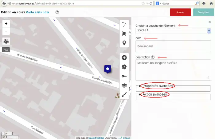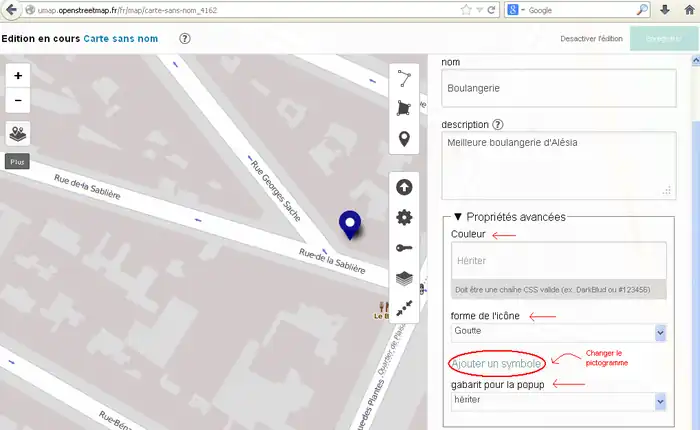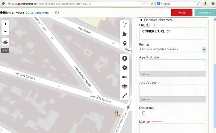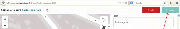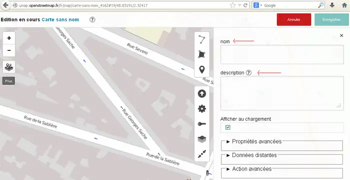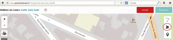 2) 左サイド7番目のボタンをクリックしてその右に開いた窓で「東京駅」などのように移動先を指定してエンターキーを押します。(2014/11/30現在、この機能はフランスの製品版インスタンスでは無効です。他(例えば http://umap.fluv.io )では有効です。)