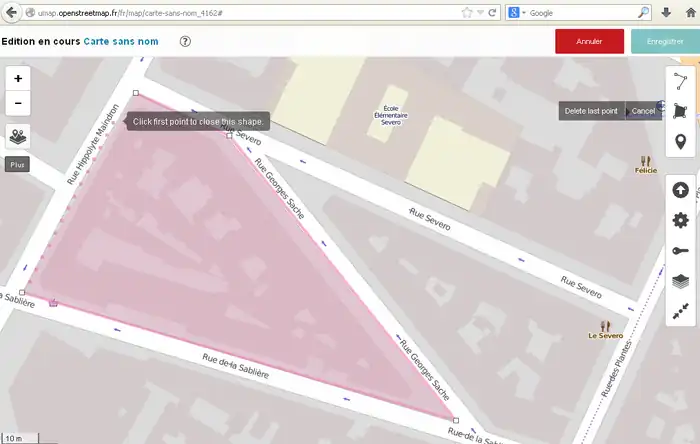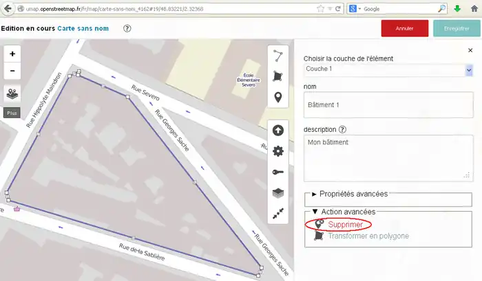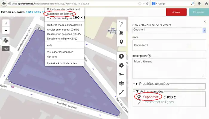 - ポリゴンを削除するには「拡張アクション」をクリックして「削除」、またはポリゴンを右クリックして「地物を削除」。
