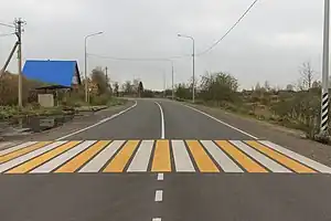 For the purposes of =*, 'markings' shall be those markings on the ground meant to draw attention to the area where slower traffic (e.g. pedestrians, horses, cyclists) is to cross the road. The standard for these markings can vary from country to country, but are usually required to be the same colour as the other road markings, in high visibility white or yellow. This is most commonly done with paint or bright bricks.