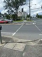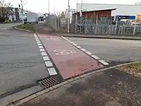 Dotted lines on either side of the crossing. The dots sometimes are reflectors slightly raised from the carriageway. (U.S.: "dashed"). In former CIS countries used as cycleway crossing markings. | ![]() |