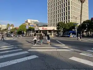 This crosswalk is painted in various colors, but it isn't a solid marking; the white lines are still required for it to be a legal crosswalk (in the US). |