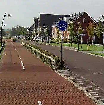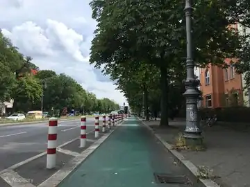 | track | A cycle track is separated from the road by curbs, parking lots, grass verges, trees, bollards or another physical barrier, but is running parallel and next to the road. In North America this is called a protected bike lane, separated bike lane, greenway, green lane, or class IV facility.[1]