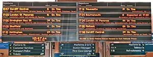 A departures or (less often) arrivals board at an airport, train station, bus terminal or stop, etc. displaying information about scheduled services, real-time info or both.
