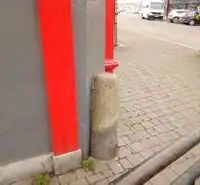 | guard_stone | A guard stone: a stone built onto or into the corner of a building or wall to prevent carriages from damaging the structure, often found on either side of an entrance to a laneway, or alongside a wall to protect it. | ![]() | |||