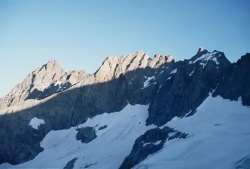 | arete | An arête, a thin, almost knife-like, ridge of rock which is typically formed when two glaciers erode parallel U-shaped valleys. | ![]() |