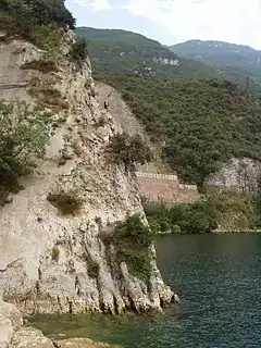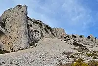 | cliff | A vertical or almost vertical natural drop in terrain, usually with a bare rock surface (leave the lower face to the right of the way). | ![]() |