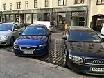 Vehicles have to park at a 90° angle so that the front or back of the vehicle is pointing straight towards the road centerline. |