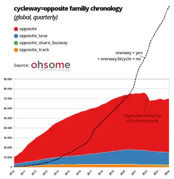 cycleway=*tags (no,lane,trackorshare_busway) in combination withoneway:bicycle=noinstead ofoppositetags. This approach is now much more widespread, making theoppositevalues redundant and basically unnecessary.