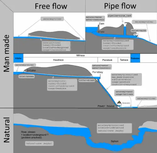 man_made=pipeline: Edit the page and add headrace as possible usagepipeline=surge_tank: Create the pagewaterway=spillway: Edit the page, indicate this value shouldn't be used any more, remove the value from waterway featurestunnel=*: Create the page, add flooded as possible value.usage=*: Edit the page, add spillway, headrace, tailrace and transmission as possible waterway values.- Relation:waterway : Add water management features as member of such relations