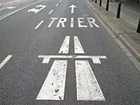 An arrow, usually to indicate turn directions, but also for indicate driving or oneway directions or overtaking hints. In contrast to other symbolic road markings, arrows are mapped as lines (instead of points) by most mappers. It is therefore recommended to map arrows as a simple line between two points corresponding to the length and direction of a single arrow with the line starting at the "foot" (base) of the arrow.