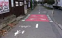 Colored road surface on a bike lane, intended as a warning indicator on a crossing.