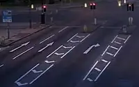 Turn lanes marked with arrows... ...from left to right separated by lane markings... ...and two different neutral areas |