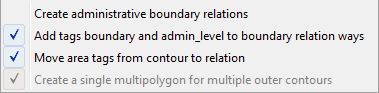 Первый пункт определяет тип создаваемого мультиполигона: он может быть отношением границы. В этом случае вас спросят административный уровень и название этой границы. Если включена вторая опция, на линии без тегов этой границы будут скопированы теги boundary=administrative и admin_level=* (при необходимости).