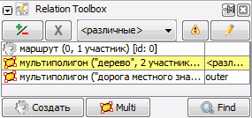 Кнопка «Создать» (Ctrl+Shift+C), очевидно, создаёт новое отношение с заданным типом и всеми выделенными объектами внутри. Оно сразу выбирается. Кнопка «Multi» (Ctrl+B) создаёт мультиполигон.