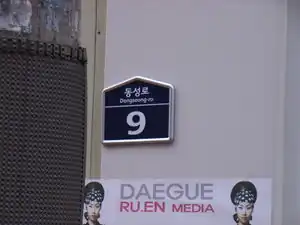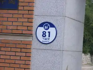 In 2009 the Korean government introduced a new street naming scheme. Across the country new street signs were installed and new house number plaques were distributed. See Korea Streetsigns history for a discussion of the history of Korean streetsigns and addresses. You will find that most name tags in Korea are still tagged with Hangeul and English (in brackets) the name tag. The convention recently changed, please follow these rules now and help the manual transition.