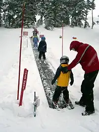 | A ski lift for small children resembling a conveyor belt. |