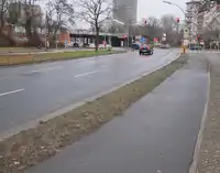 | Marks that the highway has a cycle track, or cycleway separated by a kerb, only on one side of the road. |