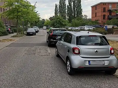 However, it can also happen that the vehicles parked staggered — sometimes on one side, sometimes on the other. The adjacent picture shows, that this also has an influence on the driving line of the flowing traffic.
