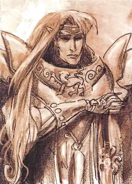 Like one of the ancient Tuatha de Danaan of legend, Finn is tall, golden, and perfect. He prefers clothing that is loose and flowing but form-fitting enough to show off his perfect body. He is rarely seen in his mortal seeming, though. In fae mien, his golden beauty is even more pronounced. His waist-length golden hair is streaked with red, and his amber eyes take on a golden glow. When dressed for battle, his chimerical armor blazes like the sun with a reddish amber glow. His house symbol is etched upon the breastplate, with whirls and curves reminiscent of the carvings on the megalithic stones of Ireland decorating the helm. His cloak changes hue from golden to rosy depending on his mood.