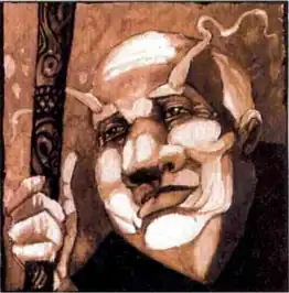 In both human and fae mien, Gwilym is a small, darkly tanned man with receding black hair and rough hands. In human seeming he appears strong and wiry but more plump and stocky as a fae. The pleasant scents of leather-soap, hay, and horses sticks to him and his clothes are those of a farmer and outdoorsman. His one treasure is his silver shod, carved birch staff of office.