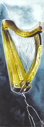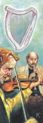 - Traditional instruments: Instruments such as the fiddle, flute, and tin whistle (also called a penny whistle) are the mainstays of Irish traditional music. Less familiar are the uillean pipes, which are similar to bagpipes except that they are pumped by bellows squeezed by the player’s right arm against their side. Bones from sheep or goats (each about 4-6 inches long) are held in one hand and knocked together to produce the complex “clickety-clickety” rhythms (somewhat like spoons are played in a jug band). The bodhran (pronounced bo-rann) is a small drum with only one head. Traditionally made of goatskin stretched over a wooden frame, it is played with a small, double-headed stick or tapped with the hand. Its rhythms provide the steady beat over which the interweaving patterns of the other instruments are laid. The Celtic harp has been around since the time of the Gaels. It was played by the great poets, and is undergoing a revival of popularity for the delicacy and intricacy it brings to traditional music. The best-known compositions for harp were composed in the 18th century by the master harpist Turlough O’Carolan. The Celtic harp is recognized the world over as the symbol of Ireland.