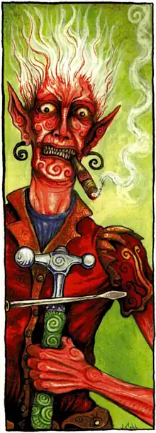 Physically they are gnarled and grotesque. They usually have pale, fish-white or red and ruddy complexions with their fae mien face looking like masks of overdone stage makeup. They have pointy ears and their translucent white or coal-black hair frames prominent brows and beady, rat-like eyes. Their skin can also be translucent and those looking closely can see a smoldering, orange glow within; like embers burning under ashes or molten iron.