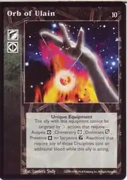 The Orb of Ulain was an artifact that protected one from the mental and emotional disciplines of the Kindred. This artifact was first mentioned in the 10th Anniversary edition of Vampire: The Eternal Struggle.