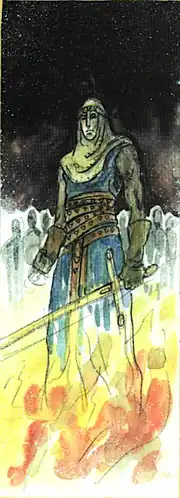 The situation for Thomas's school went from bad to worse, and several sidhe children were butchered. As Thomas battled a unit of redcaps in final, desperate battle, David returned. In his hand, David held aloft Dyfell's great blade, Caliburn. The blade burned with a bright gold, where for Dyfell it had burned blue. "Turn and face your king," he is reported to have said. I have little doubt that the redcaps believed his word when they first looked upon him, for they turned and fled shrieking into the night.