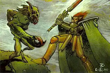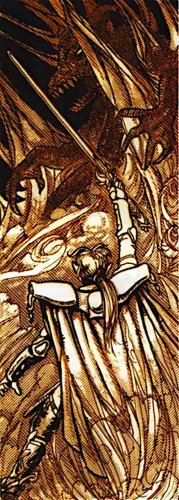 Back to the war. Dyfell was our savior then. Soldiers from all of the Five (and many commoners too) gathered beneath his green griffin-escutcheoned banner. He turned the tables on the commoners, defeating army after army, most of which were many times his in size. Victory seemed to lead to victory, and the tide began to turn. The commoners were routed in a string of major battles. It seemed as though Dyfell was blessed, but then came the Battle of Greenwich. Dyfell broke the back of the famed Eastland Troll Army, under the command of the troll, General Lyros. Street-to-street fighting took place throughout the city of New York. Lord Dyfell's regiment was ambushed in the New York "subways" by the tattered remnants of the 4th Troll Commons Battalion. Some say Dyfell died in fair battle, but the general consensus seems to be that he was killed by treachery from within his own ranks.