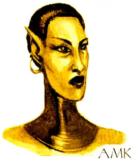 In her fae mien, her features elongate, giving her a royal demeanor. Her eyes darken until the pupil nearly disappears. She wears a long, woven tunic of green and gold over loose pants of the same material. Around her neck is a huge collar, a spiraling spring of gold, that rests on her chest and reaches to press her chin up in defiance. Similarly styled bracelets cover wrist to elbow.