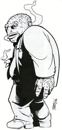 Toads appear more-or-less human, at least on first glance. They are all male, all overweight (but not grossly so, and all dress the same (stained trench coats, ill-fitting suits and scuffed shows). Furthermore, Toads are all bald, and have veritable constellations of warts adorning their heads and hands. Heavy-lidded, bulging eyes and thick, sausage-like fingers are also distinguishing features of the average Toad.